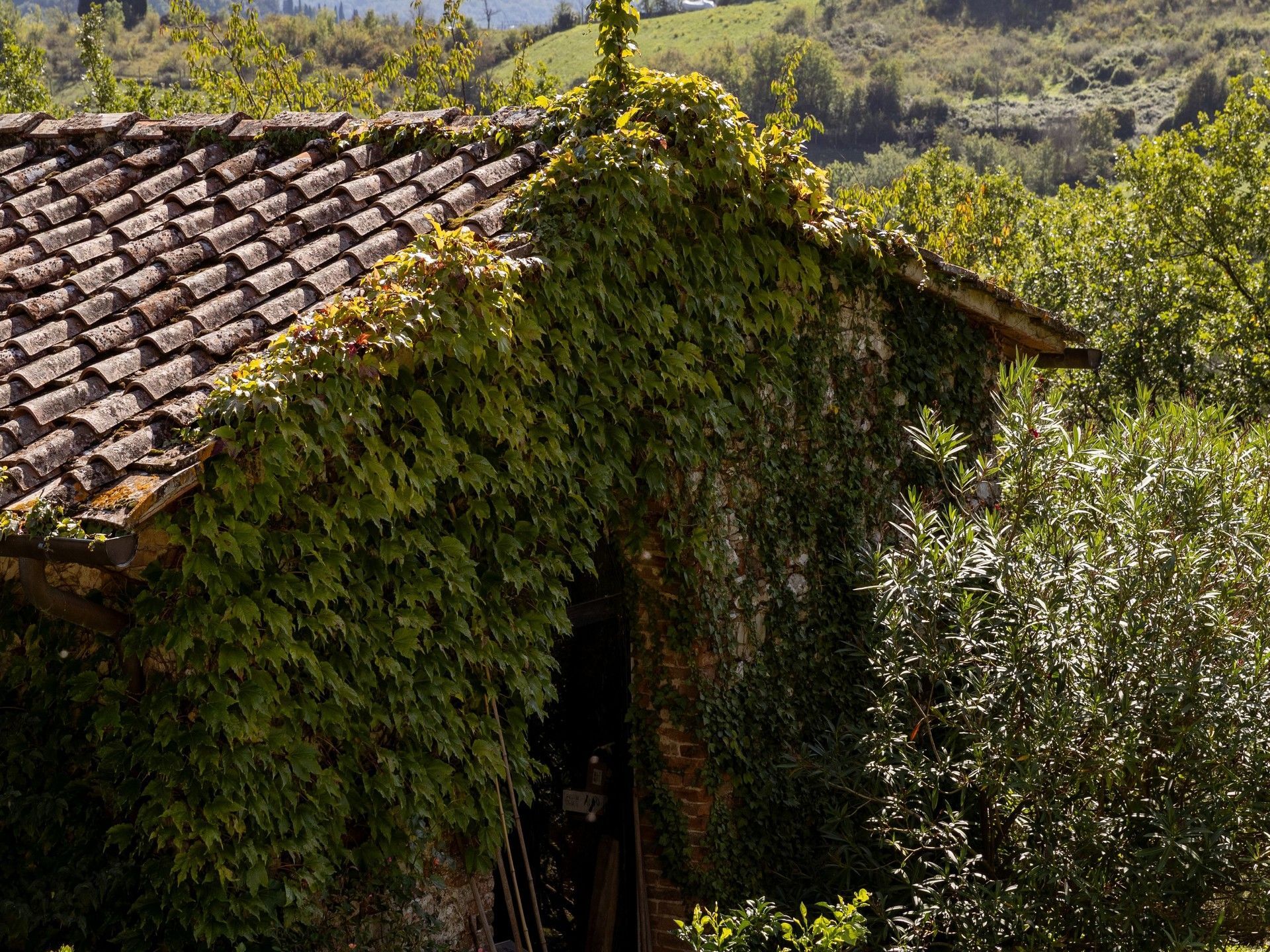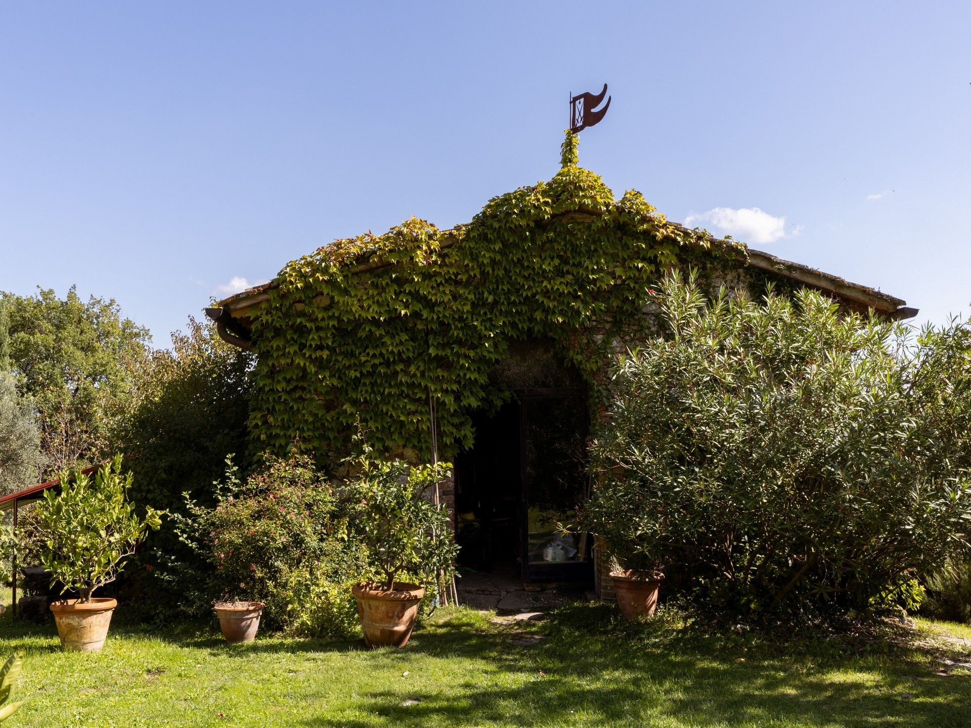 In front of the villa is the agricultural annex, a building with a simple charm, draped in climbing plants and bathed in light . Part of it has already been converted into a 108-square-meter residence with a living area, kitchenette, two bedrooms, and a bathroom. The rest retains its original beams, volumes, and materials: a space that could become a studio, guesthouse, workspace, or reception area.