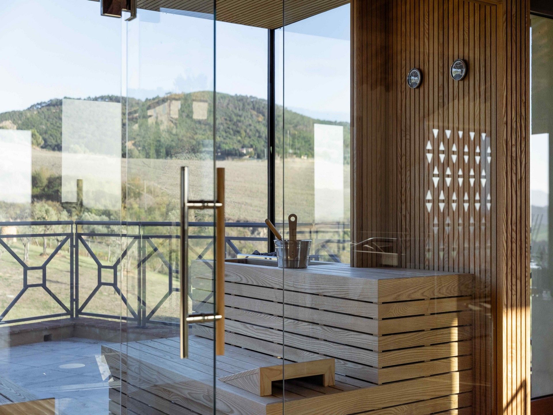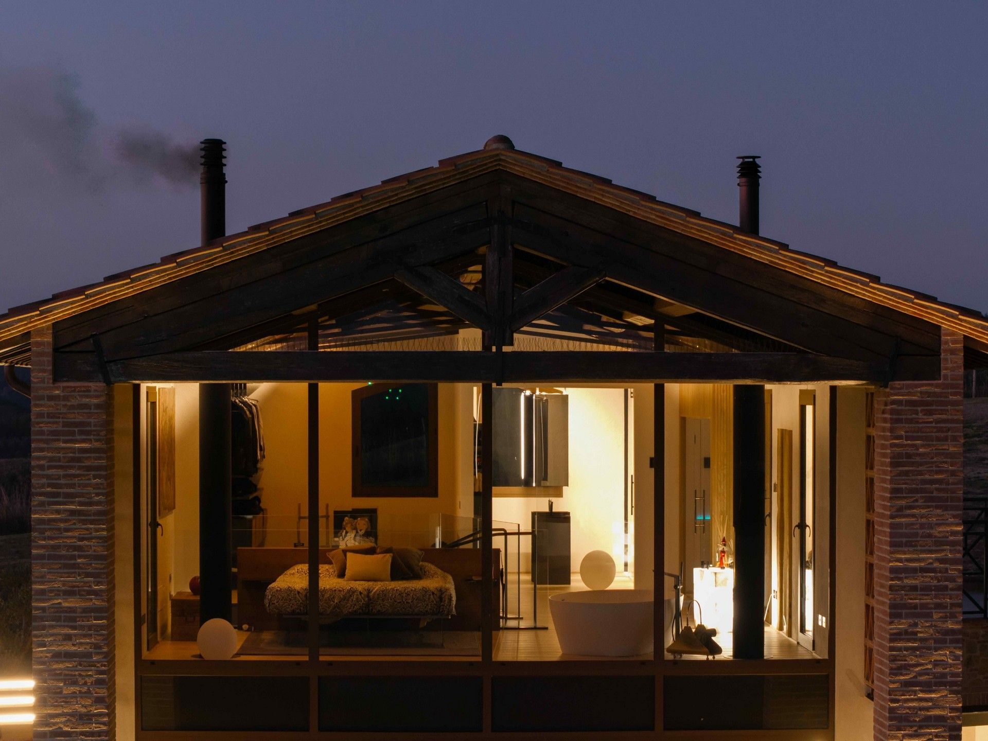 Then you go up, and everything changes. The upper floor is a single, lofty space, a truly private world: exposed beams, a glass slit that divides the horizon into two exact halves, the bed near the fireplace, the dressing area that follows the geometry of the roof, the bathroom as a natural continuation of the space. The double sauna, entirely made of glass , connects the room to the outdoor terrace, transforming this level into a sort of suite suspended between home and landscape.