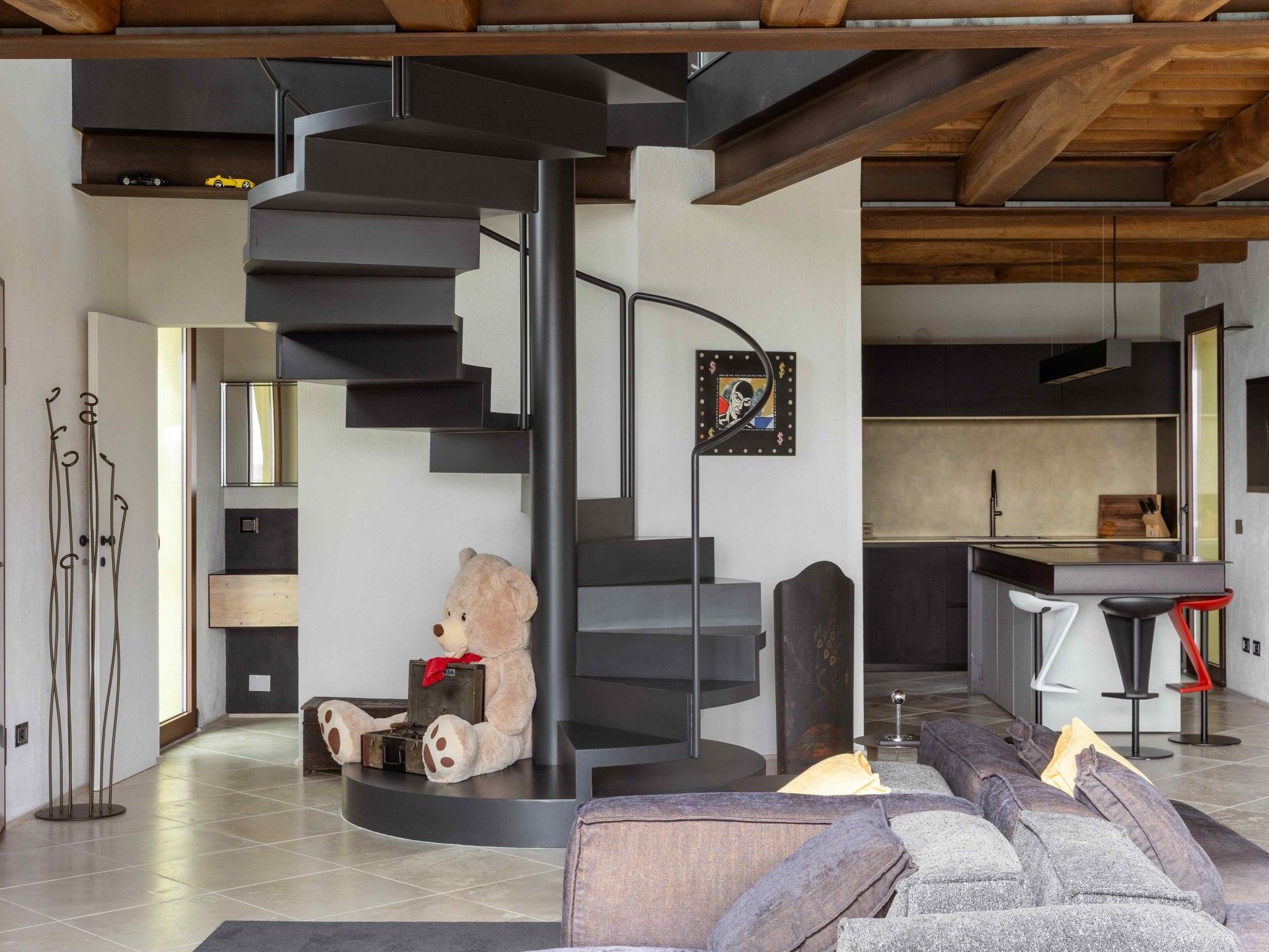 The ground floor presents itself as a single space : open, flowing, traversed by side openings and the large window framing Volterra. It's a space that doesn't need to be defined to function: the living room, kitchen, and dining room coexist without rigidity, while still leaving the possibility—but never the obligation—of creating a bedroom on this level. The suspended fireplace marks a point of balance, the kitchen with its integrated pantry creates order without being overt, and the dining room opens onto two sides: the hillside and the furnished terrace, which on sunny days becomes a natural extension of the home.