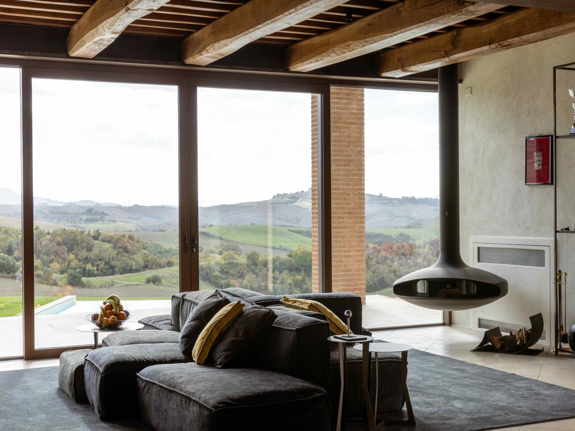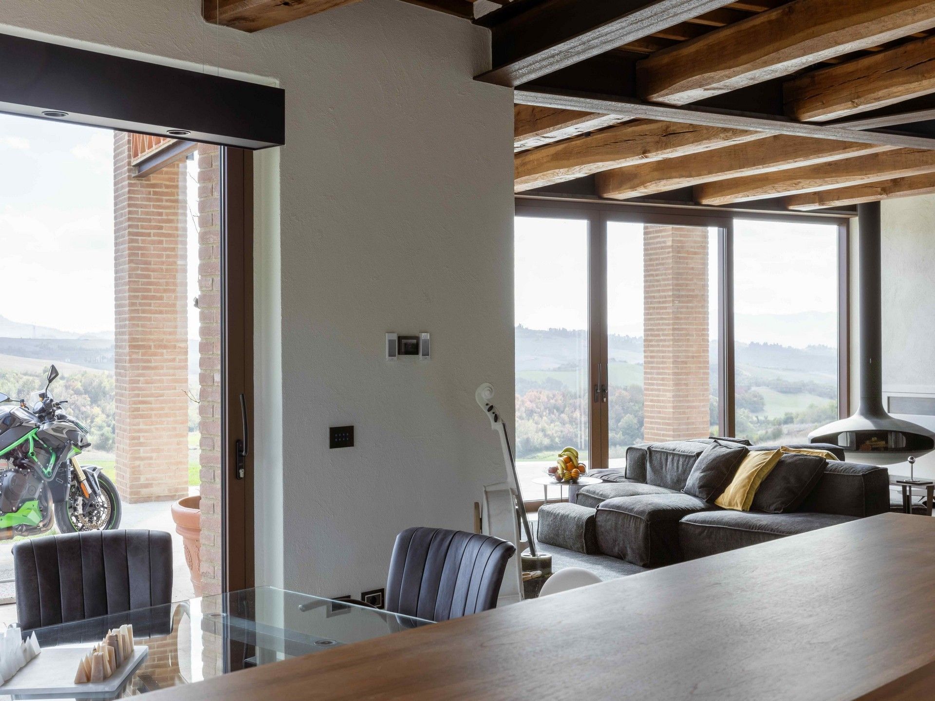 There's a spot, between Montaione and Castelfalfi, where the landscape seems to unfold for a better view. The hills open up, the light becomes clearer, and Volterra appears with a precision that never fails to astonish. This is where "Vista Privata" stands: a contemporary barn with a private view, transformed into a simple yet refined residence.