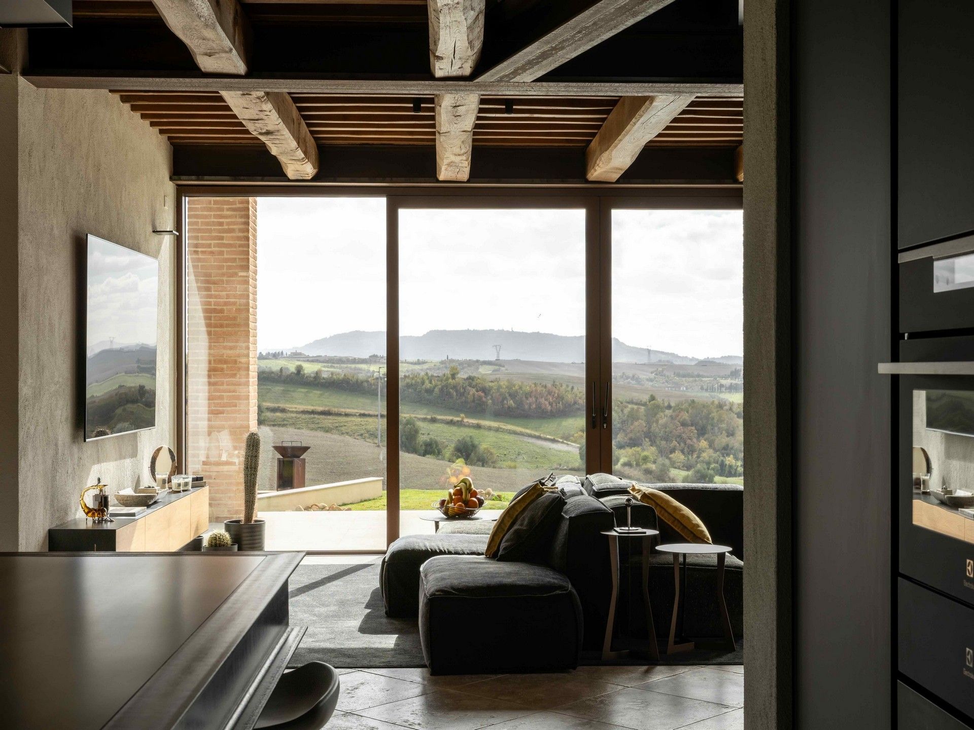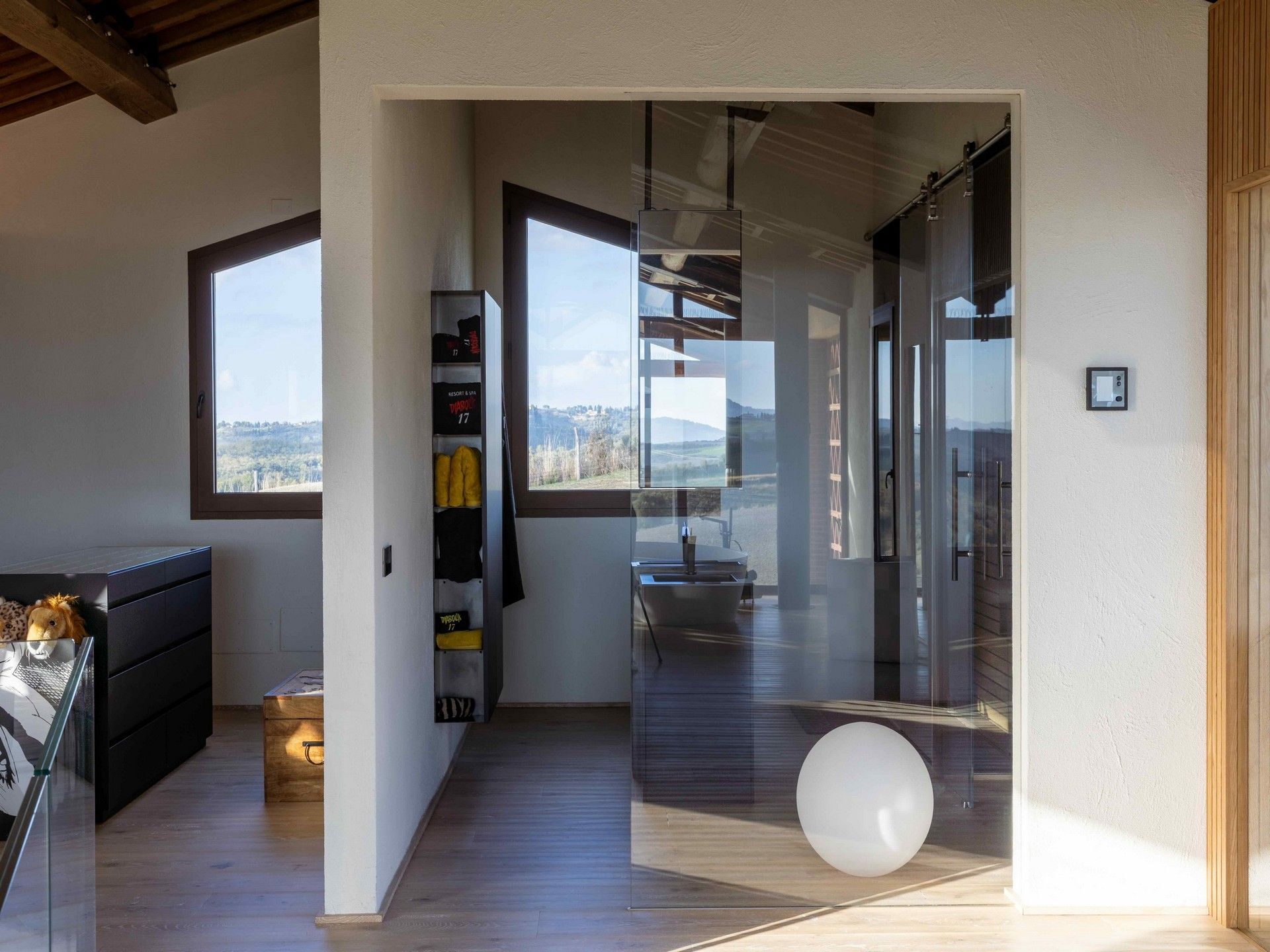 There's a spot, between Montaione and Castelfalfi, where the landscape seems to unfold for a better view. The hills open up, the light becomes clearer, and Volterra appears with a precision that never fails to astonish. This is where "Vista Privata" stands: a contemporary barn with a private view, transformed into a simple yet refined residence.