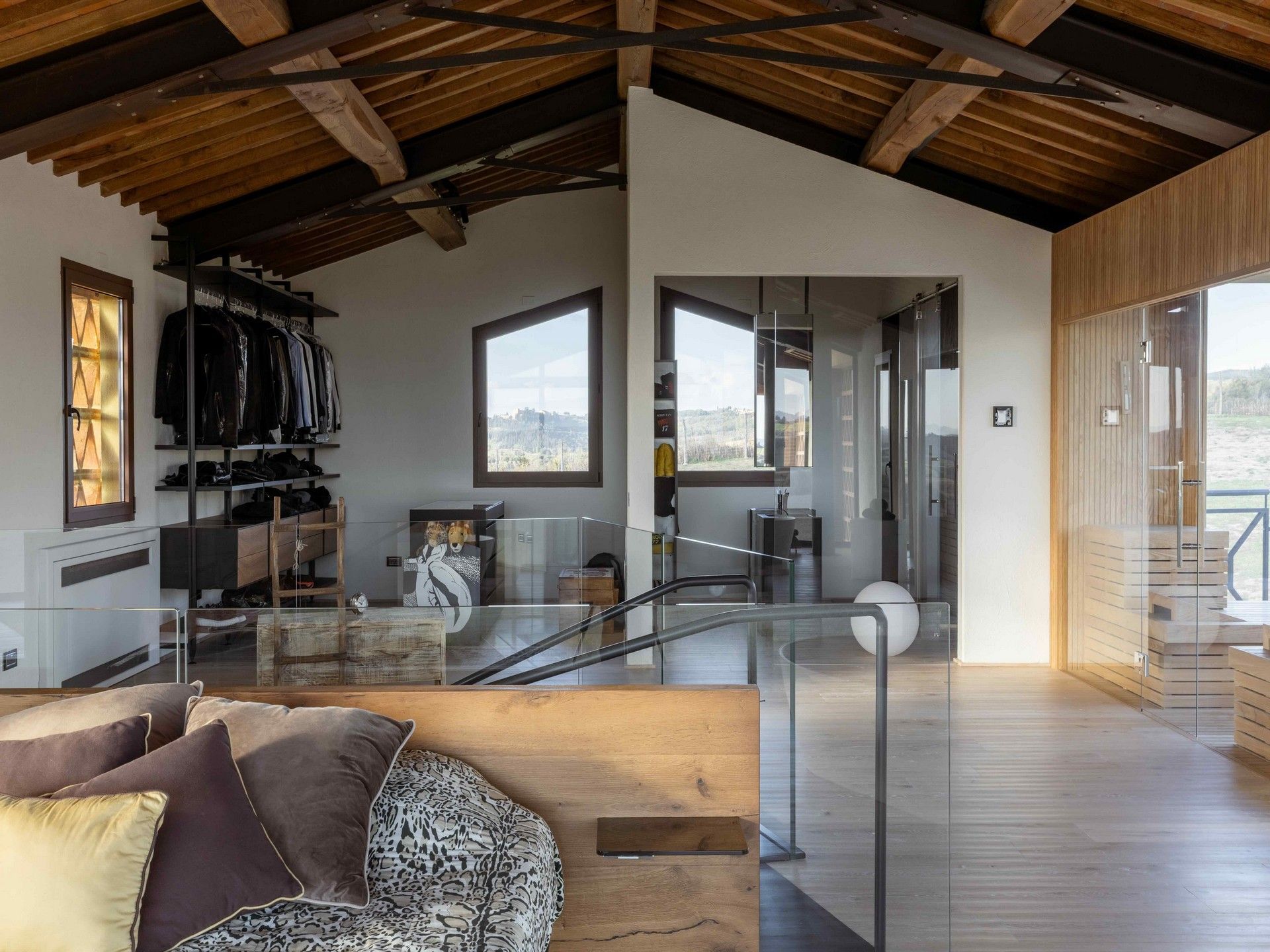 Then you go up, and everything changes. The upper floor is a single, lofty space, a truly private world: exposed beams, a glass slit that divides the horizon into two exact halves, the bed near the fireplace, the dressing area that follows the geometry of the roof, the bathroom as a natural continuation of the space. The double sauna, entirely made of glass , connects the room to the outdoor terrace, transforming this level into a sort of suite suspended between home and landscape.