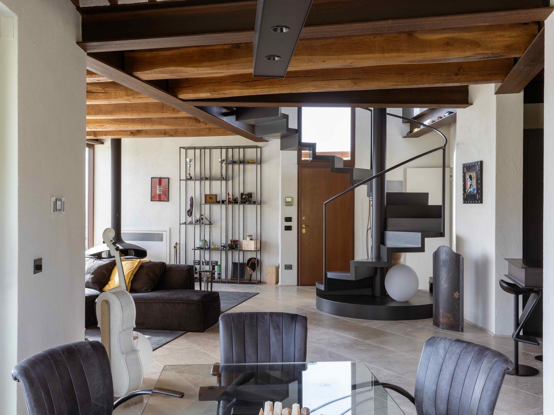 The ground floor presents itself as a single space : open, flowing, traversed by side openings and the large window framing Volterra. It's a space that doesn't need to be defined to function: the living room, kitchen, and dining room coexist without rigidity, while still leaving the possibility—but never the obligation—of creating a bedroom on this level. The suspended fireplace marks a point of balance, the kitchen with its integrated pantry creates order without being overt, and the dining room opens onto two sides: the hillside and the furnished terrace, which on sunny days becomes a natural extension of the home.