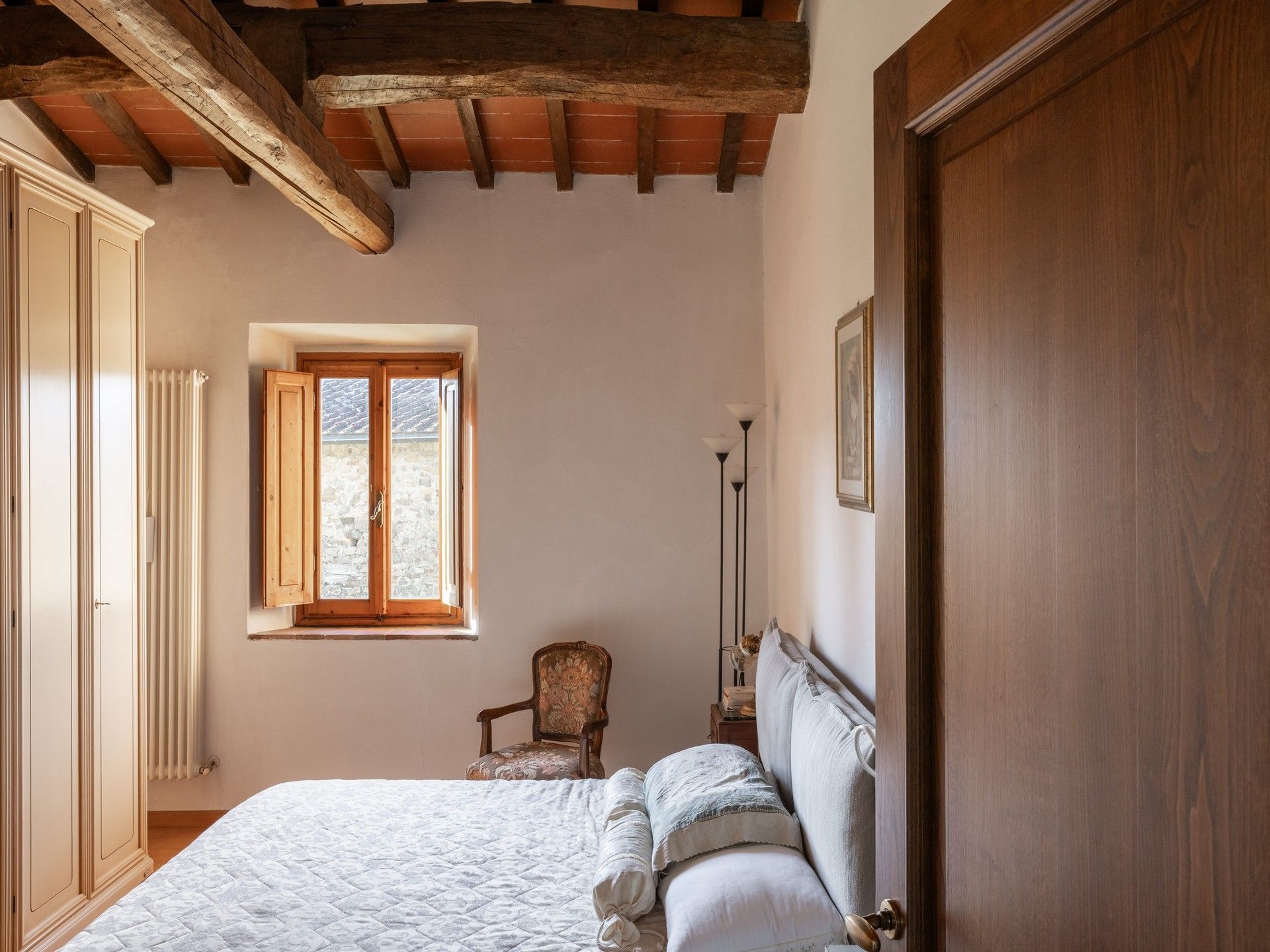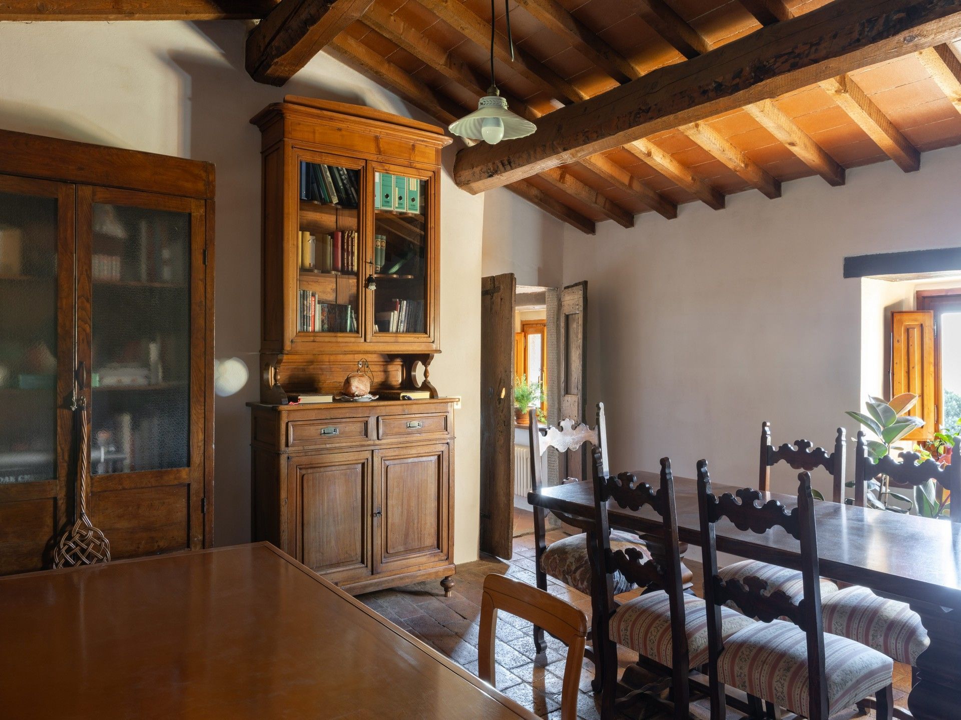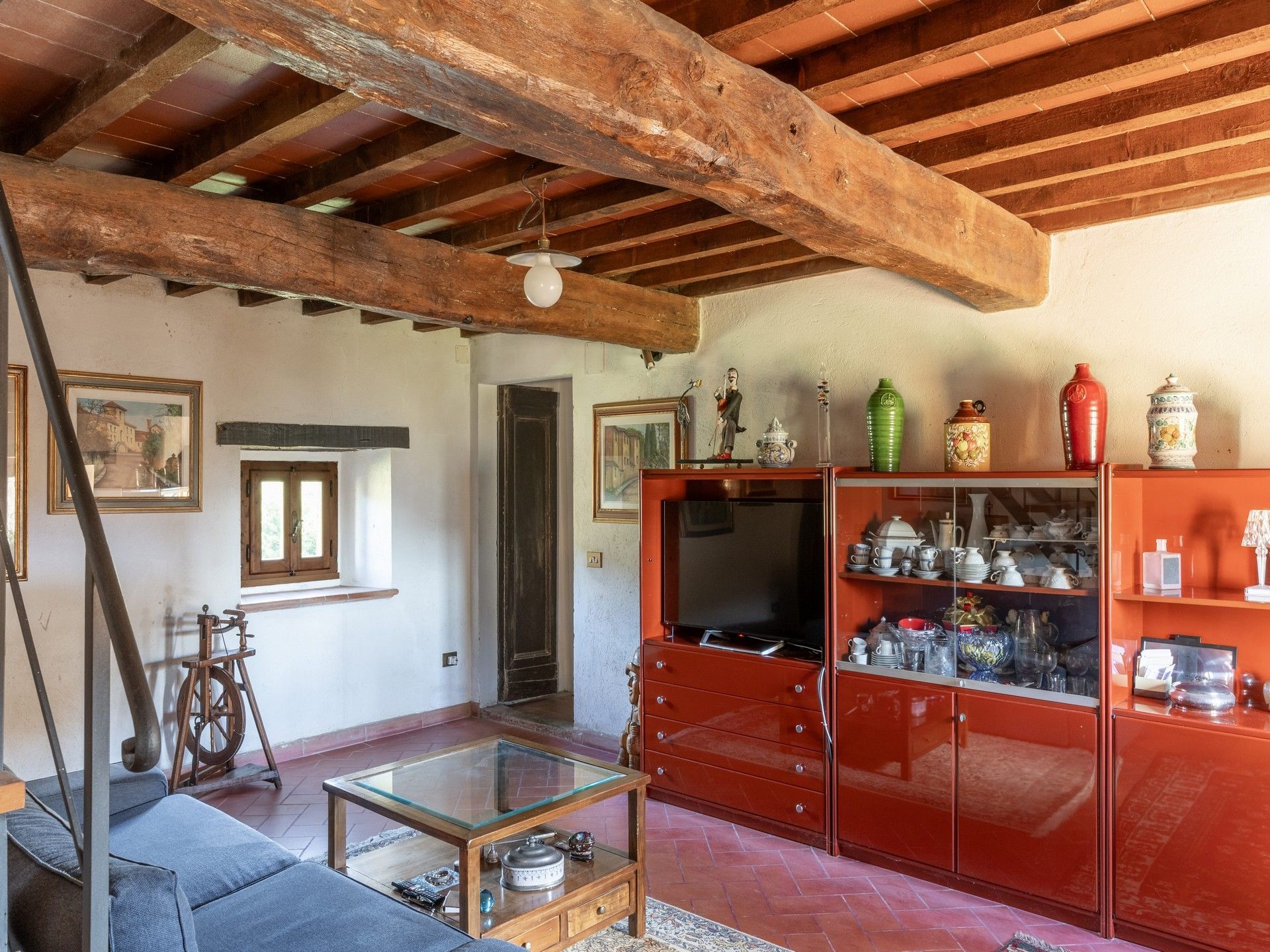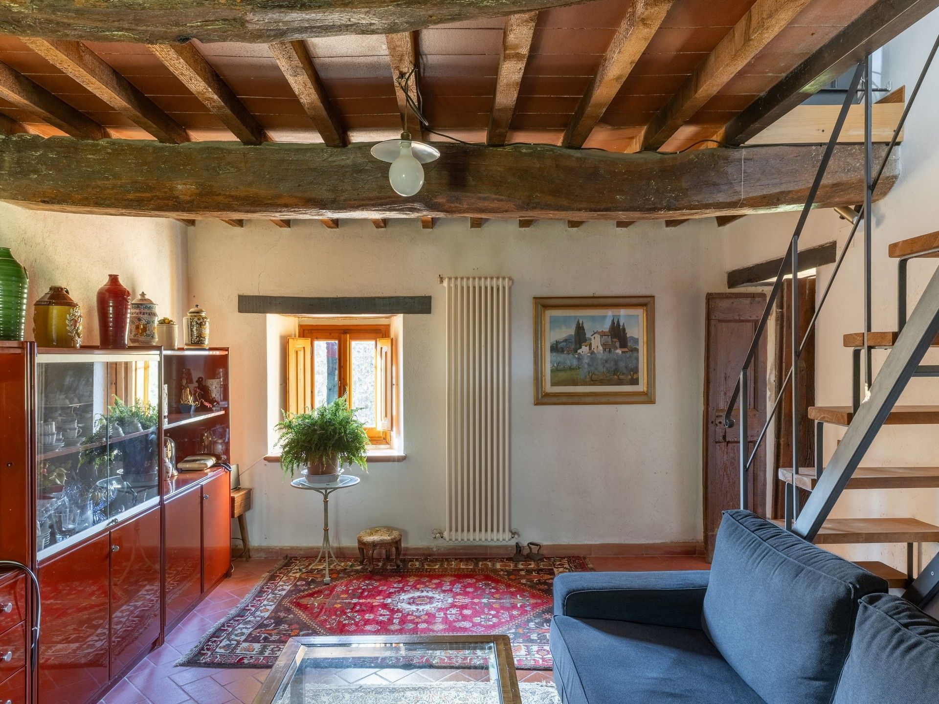Gli interni della villa conservano la solidità e il fascino della tradizione rurale toscana: pavimenti in cotto antico, travi e pianelle, camini e scale in pietra. La grande cucina con camino apre la vita quotidiana, seguita da un’ampia zona giorno, tre camere, due bagni, un ampio studio e la torre-colombaia, oggi adattata a spazio abitabile con vista straordinaria sulla valle. La seconda unità abitativa, anch’essa autonoma, si sviluppa al piano terra con soggiorno, sala da pranzo, cucinotto con accesso esterno, due camere e un bagno.