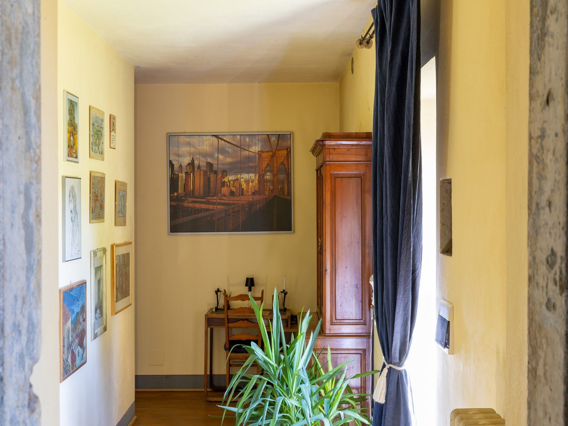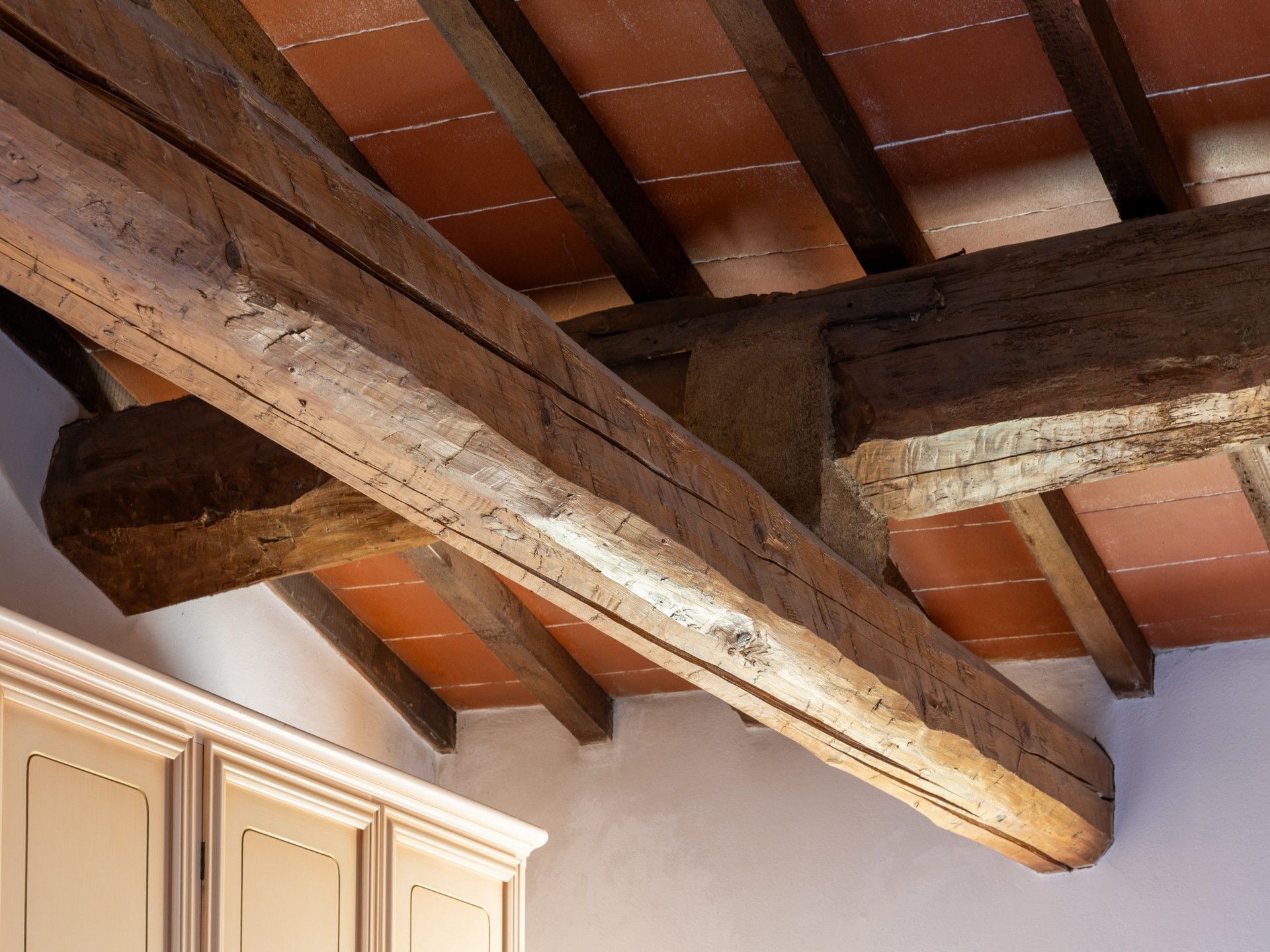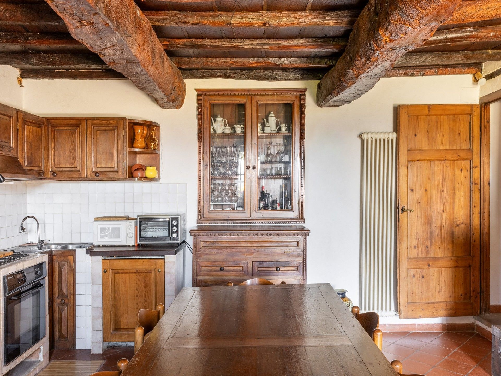 Gli interni della villa conservano la solidità e il fascino della tradizione rurale toscana: pavimenti in cotto antico, travi e pianelle, camini e scale in pietra. La grande cucina con camino apre la vita quotidiana, seguita da un’ampia zona giorno, tre camere, due bagni, un ampio studio e la torre-colombaia, oggi adattata a spazio abitabile con vista straordinaria sulla valle. La seconda unità abitativa, anch’essa autonoma, si sviluppa al piano terra con soggiorno, sala da pranzo, cucinotto con accesso esterno, due camere e un bagno.