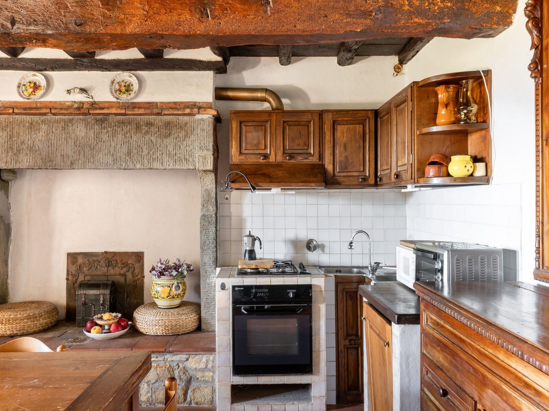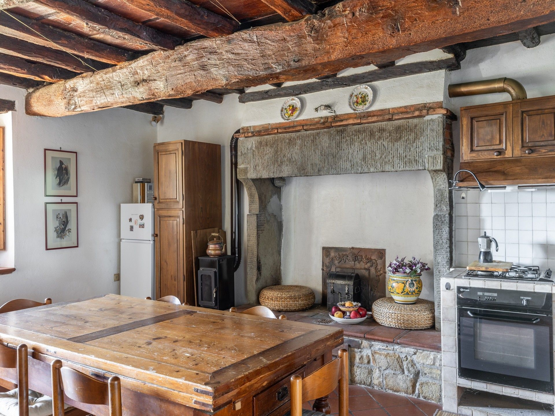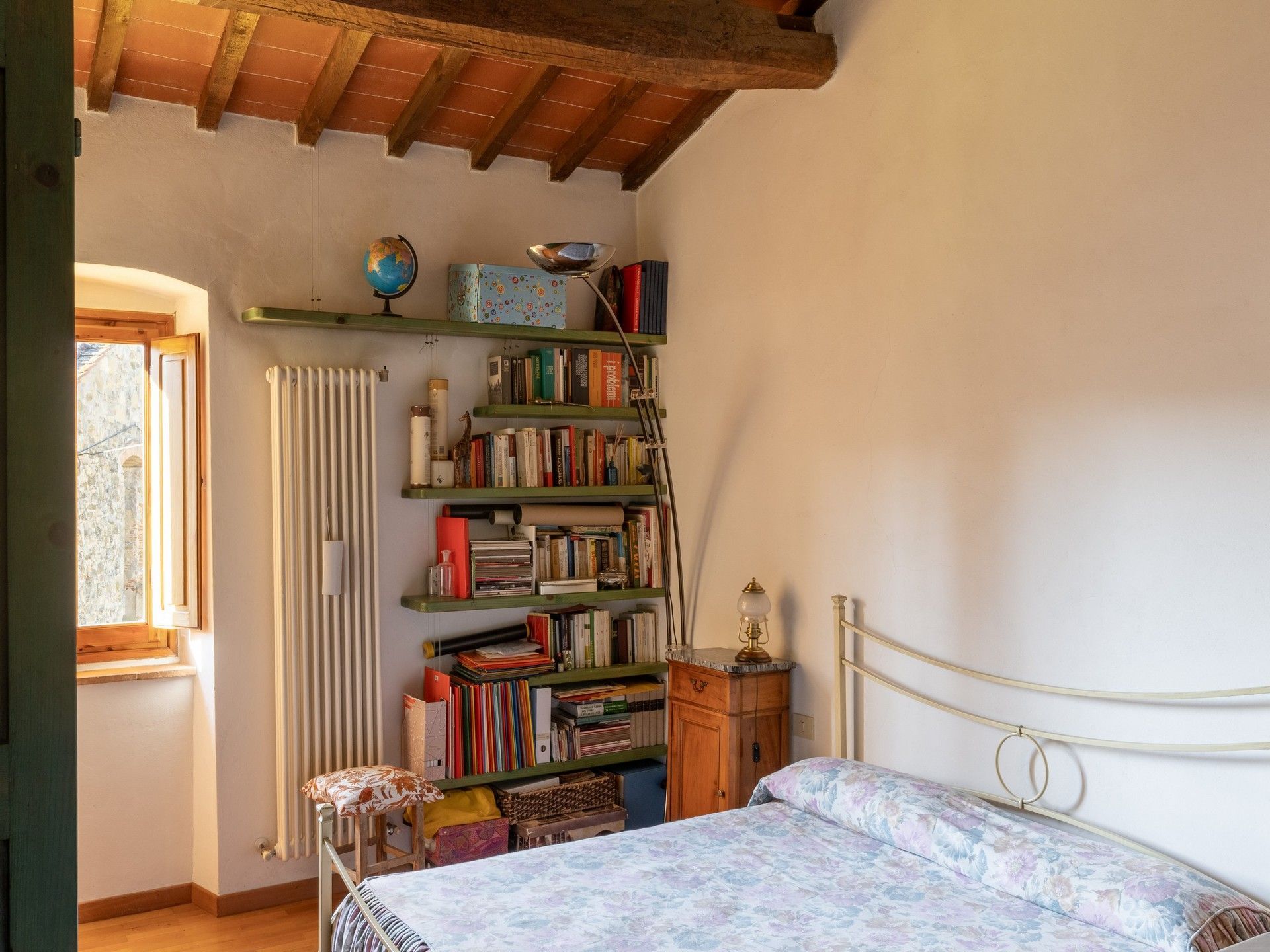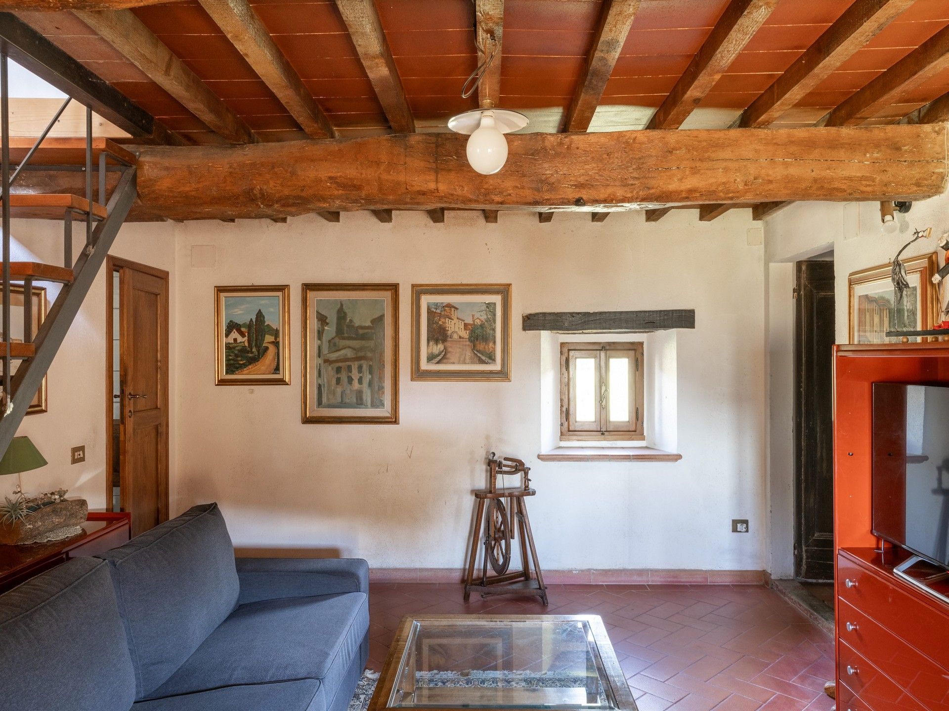 Gli interni della villa conservano la solidità e il fascino della tradizione rurale toscana: pavimenti in cotto antico, travi e pianelle, camini e scale in pietra. La grande cucina con camino apre la vita quotidiana, seguita da un’ampia zona giorno, tre camere, due bagni, un ampio studio e la torre-colombaia, oggi adattata a spazio abitabile con vista straordinaria sulla valle. La seconda unità abitativa, anch’essa autonoma, si sviluppa al piano terra con soggiorno, sala da pranzo, cucinotto con accesso esterno, due camere e un bagno.